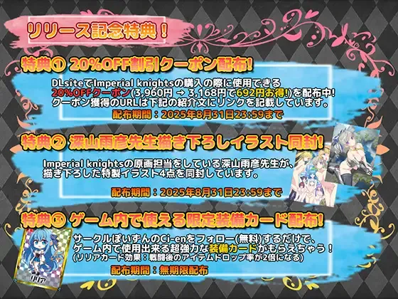 1.09更新・已报告但未修正的内容将标记为“确认完毕并正在考虑修正中”。・将技能“隐藏”的效果改为“大幅提升自身的回避力”。・修正文件中已修复的故障:・针对游戏卡顿、冻结等问题,修复了RPG Maker MV本身的故障。如果您的电脑配置足够但仍出现此类问题,请尝试1.07版本或更高版本。但由于环境差异,无法保证一定能改善,也无法提供相关支持。・为公会任务的附加条件和机制添加了注释说明。・修复了音频、图像、文本等轻微故障。・修复了迪亚娜的技能未能正确习得的问题※在应用修正文件14后,多周目游戏时会正确修复。正确习得的时机为各服装更换时。・部分公会任务的回忆未正确登记到回忆模式中※若再次查看仍未登记,请使用最新版本的游戏本体,给您带来不便敬请谅解。游戏介绍《Imperial knights》是一款以“至少能玩3次”为宣传口号的剑与魔法中世纪风王道幻想题材的成人RPG。通常游戏的周目玩法是玩家以强力状态重复体验相同剧情,而《Imperial knights》则通过序盘选项与战斗结果分支出3种截然不同的故事线,确保玩家能在保持角色强度的前提下至少进行3周目而不感到厌倦。总游戏时长超过10小时,但每条故事线仅需3-4小时,适合每日分段推进。每条路线包含40张以上的H场景,单一路线的CG数量便相当于社团过往一部完整作品的容量,总CG数突破150张(除部分公会任务事件外,通关时将解锁该路线全部回想/CG)。H场景以lun○、魔物奸等多样的凌○戏码为核心,描绘战败女主角在徒劳抵抗后惨遭蹂躏的过程,专好此道的玩家不容错过。■剧情梗概迪安娜作为名门贵族阿什利家的次女,自幼被呵护备至。这个以盛产优秀骑士闻名的家族,却因长女——女骑士”露娜·阿什利”的突然出走而沦为帝国军中的”落伍者家系”,日渐没落。目睹担任骑士团长的父亲”罗伯特·阿什利”日益憔悴,迪安娜决心暗中成为冒险者以拯救家族。然而等待她的将是交织着邂逅、离别与残酷命运的冒险——■登场角色●迪安娜·阿什利本作主角,擅长家务却剑术拙劣的深闺大小姐。为挽救家族踏上冒险,逐步卷入巨大阴谋。●其他角色含7名拥有H事件的关键女性角色,以及12名可雇佣的男性角色,共19名队友供自由组队。■系统介绍●战斗系统4人前排视角回合制战斗,19名角色可自由搭配。●护甲破坏女性角色HP低下或遭受特定技能时衣物破损,触发敌人”发情”技能与特殊凌辱攻击。●战败凌辱所有敌人战败均有专属H事件,详尽描绘女主角的末路。●卖春行为通过娼馆打工或野外苟合触发城镇中的隐藏H事件。●qingyu等级系统非Game Over的H事件积累经验值可提升等级并获取奖励道具。●快速旅行世界地图支持瞬移,减少冗余移动时间。●碾压模式当玩家等级碾压时可直接撞死杂兵,可通过选项开关此功能。■H场景CG示例哥布林群lun○战败的迪安娜被妖花阿尔劳涅刻下淫纹的迪安娜遭盗贼集团凌辱后卖为奴隶的迪安娜夜访贫民窟委身流浪汉的迪安娜■体验版范围自筹公会加盟金路线:至击败阿尔劳涅盗贼战败路线:凌辱事件后强制返回标题盗贼巢脱逃路线:至巢穴出口■正式版存档继承说明当前版本支持体验版存档继承,但未来重大系统修正可能导致兼容性问题。■活动特典与BUG反馈请关注官方渠道获取最新信息。