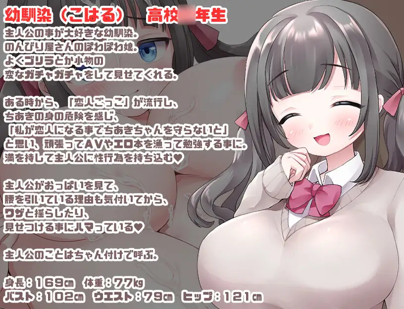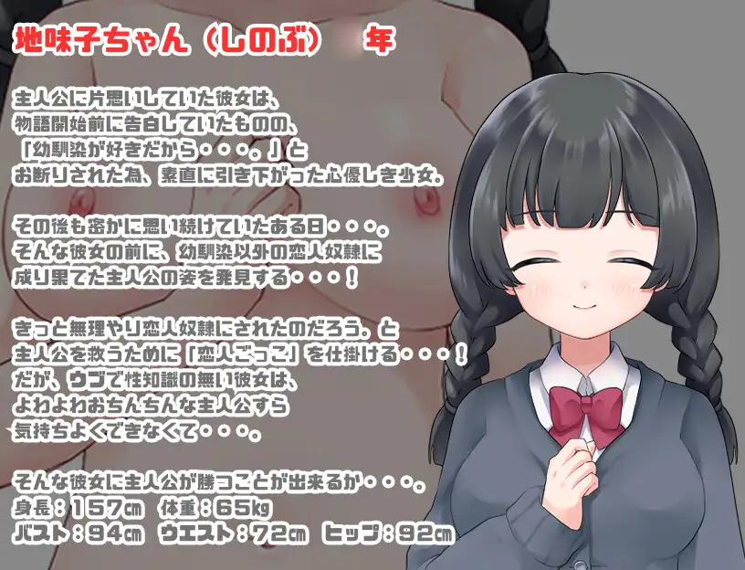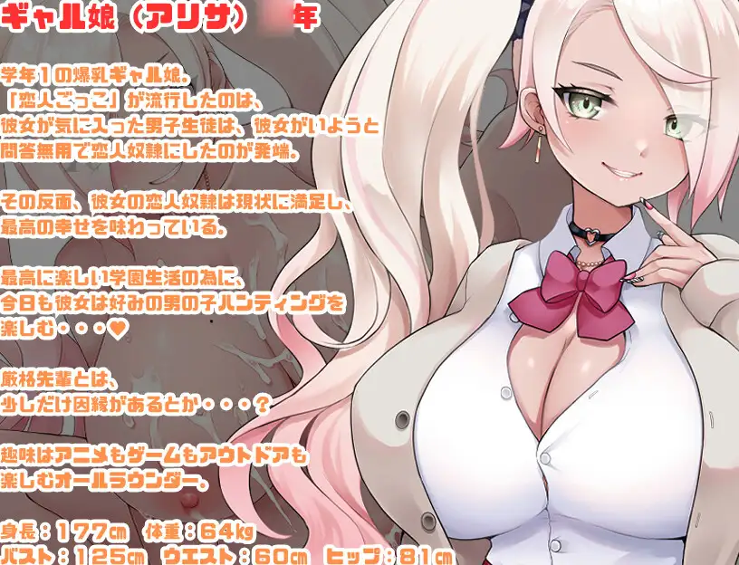 作品内容连锁的被NTR!☆梗概☆学校里突然流行起来的 “情人游戏”……游戏的目的是让你爱上一个受到性侮辱的男孩、这个离谱的游戏似乎在学校里非常流行。一天,主人公在情人游戏中被青梅竹马的恋人袭击..!为了保护他,青梅竹马的女孩决定成为他的女朋友。你能保护主人公免受女孩们的魔爪吗?你能保护主角不被即将面对他的女孩的邪恶之手伤害吗?☆游戏内容☆・青梅竹马的大腿调教!・严格前辈的皮伸长调教!・狂妄后辈没有干劲的超适当的调教(?)・朴素的孩子的英雄炖菜!☆特色☆・登场人物5人全部被反NTR的展开!・约5万字的大音量!色情事件2种NTR事件8种(内3种有选择分支)手yin4种ED4种