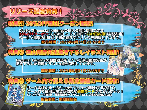 《Imperial Knights》是一款以”至少可游玩三周目”为宣传口号,主打剑与魔法中世纪风格的王道幻想题材成人RPG。与传统游戏的周目玩法(玩家以强化状态重复体验相同剧情)不同,本作通过开局选项与战斗结果将剧情划分为三条独立分支,让玩家能在保持强化状态的前提下,至少享受三lun不失新鲜感的周目体验。虽然总游戏时长超过10小时略显冗长,但每条分支剧情仅需3-4小时即可通关,玩家每日都能在恰到好处的节点暂歇,保持舒适的游戏节奏。每条分支路线包含40张以上的情色场景,仅单线内容就相当于本社团过往整部作品的CG量,总CG数更是突破150张的系列最高纪录(除部分公会任务事件外,通关时将全解锁该路线所有回想/CG)。H场景以lun奸、魔物奸等多样化的凌辱戏码为核心,着重描绘战败女主角们徒劳抵抗后惨遭敌人蹂躏的过程,专为好此道者量身定制。■剧情梗概作为历史悠久的骑士名门——阿什利家族的次女,黛安娜自幼被呵护在深闺,过着无忧无虑的生活。然而随着担任女骑士的姐姐”露娜·阿什利”突然叛逃失踪,家族被冠以”逃兵世家”的污名,在帝国内部的声望日渐衰微……目睹担任帝国骑士团长的父亲”罗伯特·阿什利”日渐消瘦的身影,黛安娜开始思索能为家族——尤其是最敬爱的父亲做些什么。当她偶然知晓”冒险者”与”冒险者公会”的存在后,便暗自下定决心踏上冒险征程。等待这位初出茅庐少女的,将是无数邂逅与别离,以及残酷的命运漩涡——