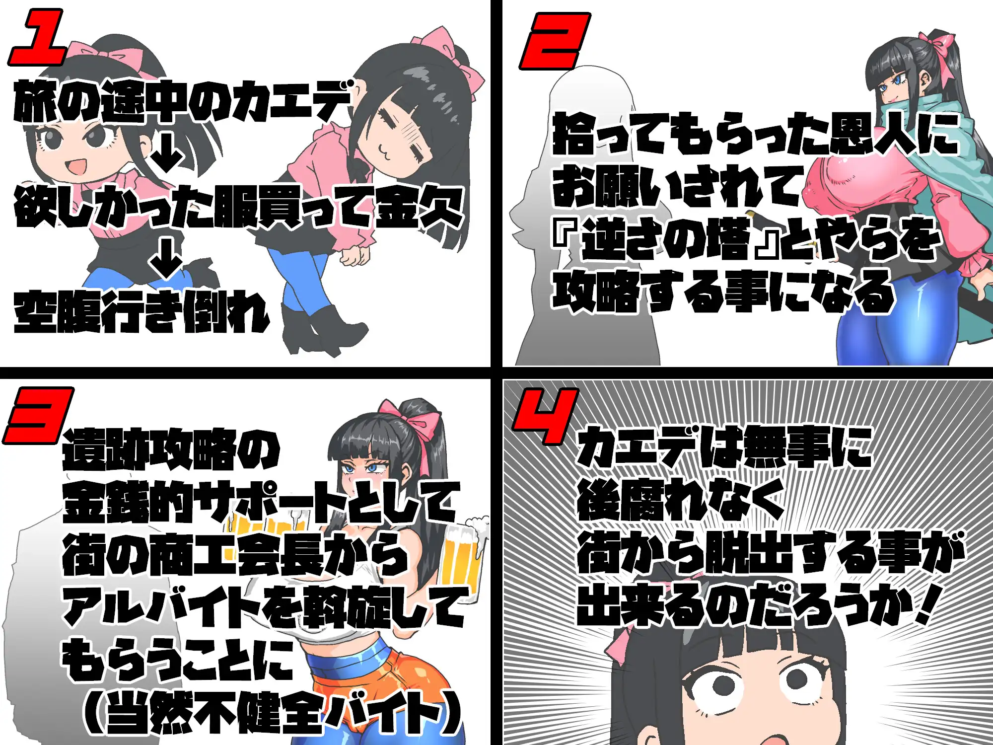 故事“…咦?这么深的夜里…又想听我讲故事吗?”“真拿你没办法呢…那么…接下来该讲还没说过的故事了……“…这回就讲讲我饿昏街头时的事吧”“当时的我穿着心心念念的地雷系服装,蹦蹦跳跳踏上旅途”“结果买完衣服身无分文,饿昏在路边了”应你的请求,倾听枫讲述往事。这样的夜晚。但今夜的故事有些与众不同。这次是枫的冒险故事。虽是攻略《逆塔》的冒险谭……却穿插着为筹集资金接受商会会长介绍的打工——内容充满性骚扰,甚至包含枫被侵犯的情节。些许NTR剧情与香艳展开。外加攻略神秘遗迹《逆塔》。你将重温女剑士枫的冒险——————天呐!《女骑士与女仆与伪娘》衍生作!※当然只玩本作也毫无问题以《女骑士》中登场的女仆枫为主角!讲述她成为女仆前的故事!惊喜!衍生故事!!没错!就是想喊声”衍生作”!”衍生作”!超帅气的!!※剧情无关联性,单独游玩毫无问题※※本作使用RPG Maker MZ制作※从据点城镇前往迷宫《逆塔》,击败各层头目前往下一层。同时可在城镇商店通过商会会长提供的打工赚钱。酒馆打工被迫穿性感服装/看店打工被迫穿性感服装/秘书打工被迫穿性感服装。请反复进行迷宫探索与打工情色事件,向通关目标迈进。战斗仅由枫独自进行。相应地,装备栏中饰品槽大幅增加。武器与防具固定不变。请组合装备多个饰品部件——如”攻击次数+1″或”HP+200″——强化枫以赢得战斗。打工赚钱购买的丝带也具备各类效果。但打工收入有限,购物还请精打细算……(游戏中的猫会提供新手教学,遇到困难请找它聊聊)