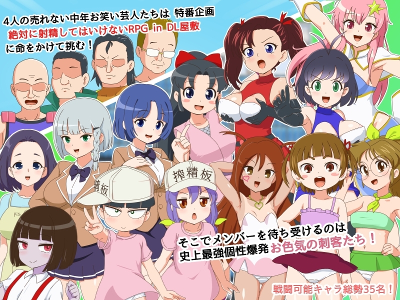 ■ 作品概要这是一款以搞笑综艺节目为题材,充满动画演出的情色综艺风格战斗性爱RPG!■ 故事剧情挑战这个企划的是4位过气的中年搞笑艺人!等待他们的是史上最强、个性爆发的情色刺客们!布满各种陷阱的色欲迷宫「DL宅邸」将阻挡他们的去路!踏入此地的人,无论发生什么,都绝对不允许she精!在肉欲的舞台上,悲鸣与娇喘交织的宏大冒险剧面对汹涌的qingyu,你能忍住不she吗!?从性感大姐姐到清纯小妹,甚至机器人和妖怪,应有尽有!赌上性命的性爱战斗!不想死的话就拼命忍耐吧!想赢就用胯下的剑反击!这是废柴中年们 用血、汗、泪与jingye写下的故事■ 内容量等基本CG数量 约60张以上(其中包含动画演出的约50个镜头)基本立绘约20张以上其他插入画面・迷你CG大量※部分基本CG会复用在不同角色上