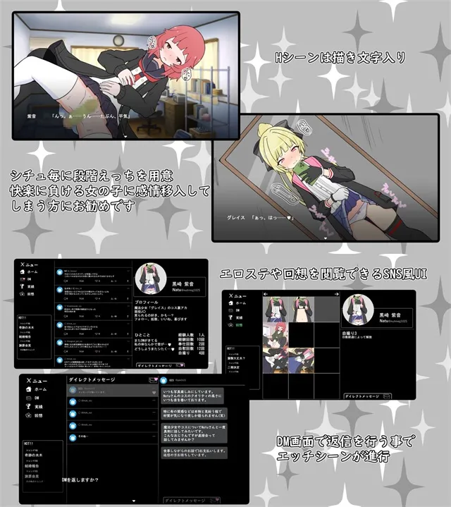 故事背景这是一个邪恶组织与魔法少女不断交战的世界,这样的场景已成为日常。魔法少女作为一种文化现象已深深融入社会。有的魔法少女隶属于企业,以宣传企业技术实力为目的展开活动;有的则不属于任何企业,通过直播等方式独立行动的个体魔法少女。在SNS社交平台上,她们的故事日夜被传播、被消费。某天,如彗星般突然出现的谜之魔法少女Grace(格蕾丝),以其超凡绝伦的力量瞬间成为全社会的焦点。============魔法少女竟惨遭败北凌○!(※含胁迫、催○情节)所有情色场景均为渐进式展开推荐给喜欢因欲求不满而深陷快感、逐渐丧失理智的女孩子,以及渴望情感代入的玩家!基本CG数量14张 预计场景数27个体验版可预览9种H场景采用SNS风格UI的色情状态界面,时间线会随机变化特定事件后还能解锁专属内容…?回想功能中会标注未开放事件的解锁条件助您轻松收集全CG!主线外的情色场景需通过回复DM短信推进是否回应由您决定…