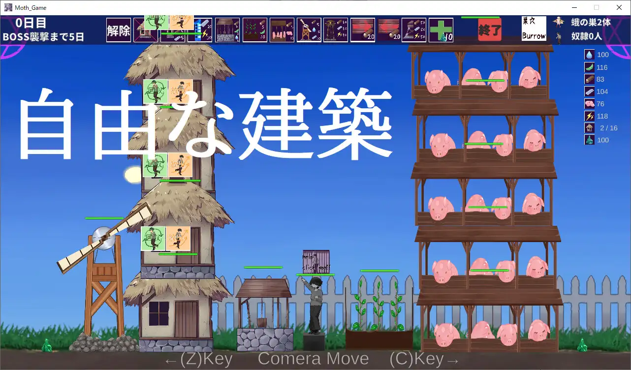 游戏概要・为了抵御飞蛾的袭击,与创造主(玩家)和村民一起打造最强村庄吧!!本作是一款模拟类塔防游戏。丰富的角色与建筑资料可查看每个角色及自然物的详细说明并能阅览关联图表掌握建筑物的特性找到有利的战斗策略吧