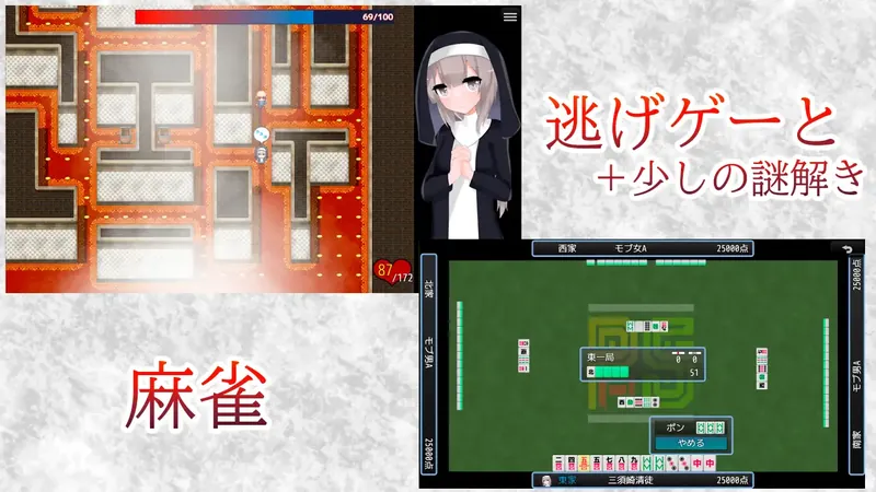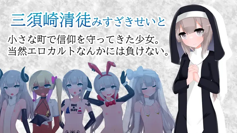 ■ 故事梗概三须崎清徒(みすざきせいと)在一个乡村小镇的孤儿院中长大。她重视信仰与清贫,深受当地居民喜爱,被亲切地称为“圣女酱”。她一边为维持养育她的传统宗教团体的运营而烦恼,一边像普通少女一样为心仪的男孩子而心动,过着平凡的日子。然而某天,一个道德沦丧、以性至上的色情邪教出现在她面前。■ 游戏内容这是一个讲述善良而虔诚的修女少女突然被色情邪教陷害,失去一切的故事。游戏中没有战斗。目标是通过解谜、逃脱游戏以及麻将小游戏,逃离色情邪教的魔爪。虽然麻将元素较重,但计划加入自动模式,请放心。此外,玩家可以从一开始就浏览所有场景,无需参与游戏部分。■ 结局通过完美操作,可以达成完全没有色情内容的结局!□ 多种结局【正史】堕入色欲邪教睡眠妨碍大叔失败结局呼吸憎恶大叔失败结局乳首与敏感部位重点攻击失败结局动物爱好者大叔失败结局援交毒瘾荡妇结局BBC失败QoS结局恶魔化断角结局包含120张以上插画、10万字以上的色情场景(不含差分)。※ 计划追加新剧情。■ 额外内容在回忆房间中可体验以下额外内容:可从一开始浏览所有色情事件。提供四人麻将、三人麻将、四人麻将无上限规则、三人麻将无上限规则的自由麻将模式(可选择三种强度等级)。【通关特典】可与前作《寝取大叔的房间》《被寝取的幼妻》《天才魔法少女被无理尊严破坏的故事》的女主角“雫”“柚季”“彩辉”同桌对战(可选择使用的女主角)。※只要将更新后的 save 文件夹复制到 exe 文件所在的位置,就能继承过去的存档数据和配置。■ 更新信息 追加了“被寝取的圣女酱”结局。 追加了两段单张插画的迷你事件。 追加了“奶牛化榨乳地狱”结局。 修复了事件场景插图错位的问题,并附带了女主视角的存档数据。 修复了第二章收集全部勋章后会导致无法推进的BUG修复了第五章对话循环的异常问题修复了第十章的事件战中可以战胜Boss的BUG为防止被误判为病毒,已停止使用打包软件