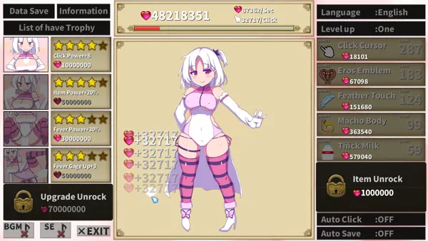 游戏简介:这是《 hentai 女孩点击器》!动漫和 hentai 女孩……♡点击与放置!收集可爱女孩们的心,欣赏她们调皮的模样!点击可爱的女孩来激活 “狂热模式”,提升你的点击力!用通过点击积累的心来升级你的物品!不断成长以获得更多的心!成就让点击变得更有价值!努力获得成就奖杯吧!你可以享受这款点击器游戏,大约有 2 小时的游戏时长。