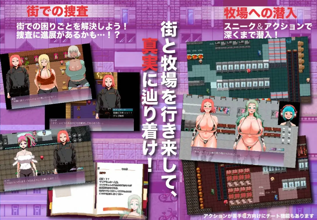 人间牧场系列 第三弹!! 这次的女主角是刑警!!能够制压非法的秘密人类牧场吗!!?在这个世界中,公立的「人类牧场」已经设置。通常的「人类牧场」中,母牛的女性受到细心的对待,但似乎存在着非法的牧场,女性被诱拐、监禁,受到酷待……为了制压这样的非法牧场,三位刑警潜入其中!人间牧场系列「更生篇」「实习篇」之后,专注榨乳的RPG!本作包含了牧场以外的城市的大量活动!榨乳当然少不了,除此之外,还有「露出」「性感按摩」「调教」「墙臀」等各种性癖展开!(!注意!有身体缺损、兽○表现。不适者请注意。)有打开所有色情场景的开关。不过结局未能解锁。对不擅长动作的玩家,还有秘技功能。*「人间牧场」系列的剧情并非连续,所以可以从任何作品开始享受。