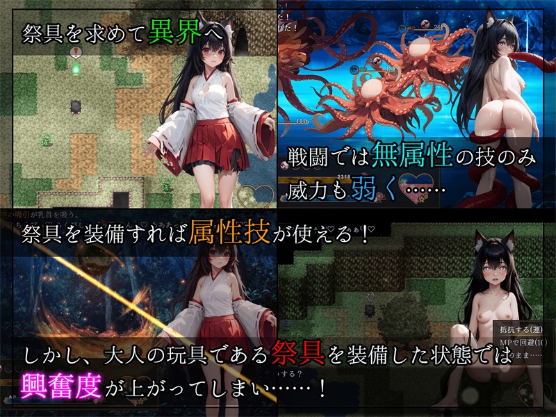 使用祭具(大人的玩具)拯救村庄的和风RPG故事讲述一名少女千鞠在追求废弃的胧月村的发展而冒险的过程。相信透过重振古老的祭典可以为村庄带来活力,她决定寻找三件祭具,前往被称为异界的地方!祭具不仅可以在仪式中使用,还可以作为战斗装备使用。…然而,实际上那些祭具是「淫荡的大人玩具」!纯真的千鞠并没有察觉到这一点,一次又一次地做出令人羞耻的行为…。胧月村的巫女「千鞠」拥有狐狸耳朵的神秘少女…「千鞠」。千鞠受到胧月村村长的请托,决定协助村庄的重建!为了收集淫荡的祭具,她使用神明赐予的「刀」进行战斗,玩家也可以根据判断在战斗中使用祭具!原本只能使用无属性的刀技的千鞠,随着祭具的使用使得强力技能日渐增多!…然而,这些过于强大的技能也有代价…。使用祭具意味着使用「大人的玩具」…。千鞠在战斗中疯狂地出击…。她到底会成为大人玩具的俘虏吗! …还是其他。村中也有许多困扰的人!在执行任务与帮助的过程中,偶尔还会遇到淫荡的情况! ?…没想到村民们根本想不到,纯真的千鞠的衣服下竟然装着大人玩具,完全无法想像…。千鞠在集齐祭具后,在「仪式的舞」中穿戴所有祭具表演舞蹈!…这样一来村庄的繁荣应该会实现…却引发了意想不到的事态!