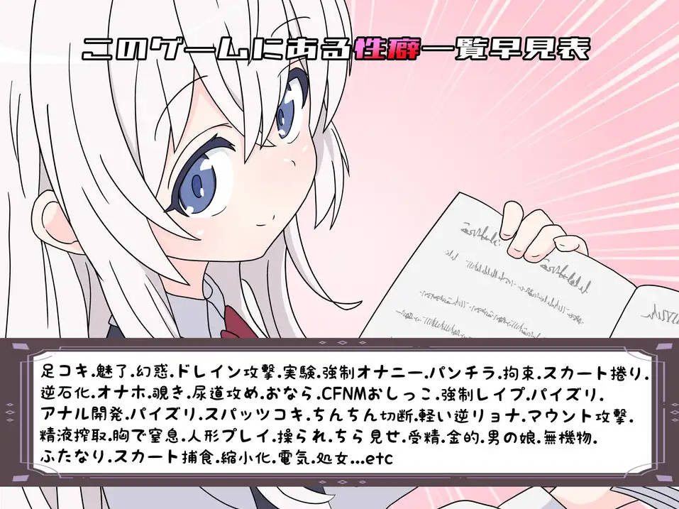 魔王诞生,勇者选拔考试召开。为了拯救村庄,主人公决心参加勇者选拔考试。究竟能否战胜诱惑,顺利成为勇者并拯救村庄呢——!?●关于 H 场景 压倒性的内容量!H 场景 123 个,包含差分 CG 超过 1000 张!●关于体验版 可游玩 H 场景 42 个。只需转移存档数据,即可立即继承至正式版!●附赠各 Boss 战前的存档数据 可用于场景回看或与 Boss 再次对战时使用●其他 本作由 RPG 制作大师 MZ 开发完成。