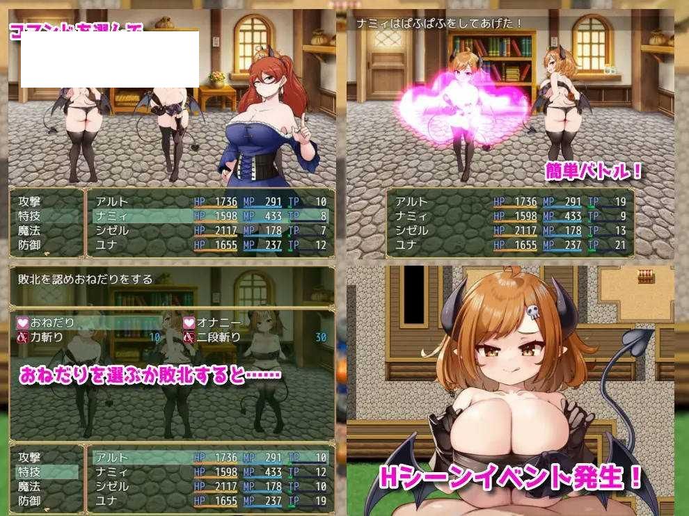 〇故事在一个叫“纳吉拉村”的乡村,有人去采集矿石后便一直没有回来,发生了一桩失踪事件。主人公和青梅竹马的纳米伊的魔法教师“伊西亚”受村民所托,前去调查事件,但伊西亚也没有回来。苦恼之下,两人决定去找伊西亚。然而,追寻着伊西亚进入洞穴深处时,展现在他们眼前的是一个从未见过的村落,“恶魔村”就这样在他们眼前展开——。〇类型短篇逆强暴RPG〇游戏内容骑乘位、乳交、足jiao、臀交、大腿交、乳搓手交、偷窥自wei等〇游戏时间约2小时〇系统– 在战斗中败给淫魔会触发逆强暴,使用乞求技能会触发不同台词的逆强暴– 在受虐模式下乞求会触发更多变化的台词– 有与伙伴的H场景– 可从菜单中与伙伴对话– 可从菜单中移动到各地,或设置HP1、受虐模式和遇敌设置– 淫魔及主要角色有配音(部分事件没有配音)– 有回想功能