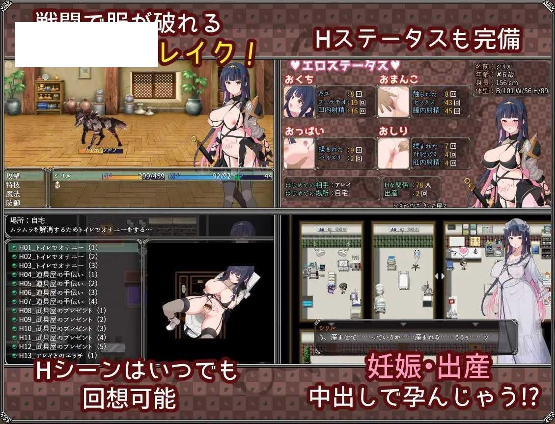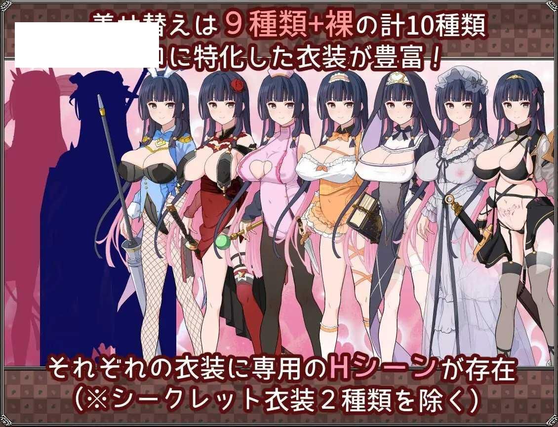 【游戏特色】• 强化了砍杀(Hack and Slash)元素,自由度更高。• 主角等级和属性无限上升的超通胀游戏。• 拥有众多丰富且个性化的技能,战略性多样。【关于情色场景】总计 105 个场景• 主要场景(使用单独 CG)55 个• 次要场景(使用通用 CG)50 个【CG 数量】・基本 CG 共 80 张・差分超过 500 张【换装相关】• 换装种类:9 种 + 裸体差异※ 包含 2 种秘密服装 特定服装或裸体状态需提升“淫欲度”方可解锁。【H 元素】・装甲破坏 主人公在受到一定次数的攻击后,服装会逐渐破损。服装随时可以修复。・H 状态・怀孕/分娩【深入要素】游戏中存在许多与故事推进无关的深入要素。 要完全通关所有内容极其困难。【其他系统】・可处女通关・多重结局・游戏包含周目要素【便捷功能】・战斗加速・战斗结果自动处理・跳过开场动画・消息窗口临时隐藏・通过帮助了解操作说明及术语解释・结局后可完全解锁所有成人场景【没有哦!】·战斗情色(仅限衣物破损)·战斗失败情色·情色类不良状态