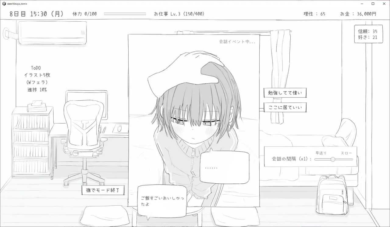 2024年11月23日 修改错字 BUG修复細かい不具合修正を行いました。贩卖日:2024年11月14日 0点分类:触摸/抚摸 萝 妹妹 日常/生活 婚前同居 睡奸/迷奸 怀孕概要开发白天健全地和妹妹一起度过每一天,晚上毫无防备地安然入睡的妹妹的身体的概念的游戏。睡觉的时候以外不做色情的事。睡眠〇是唯一的作品。到结局的预想游戏时间是3小时左右。