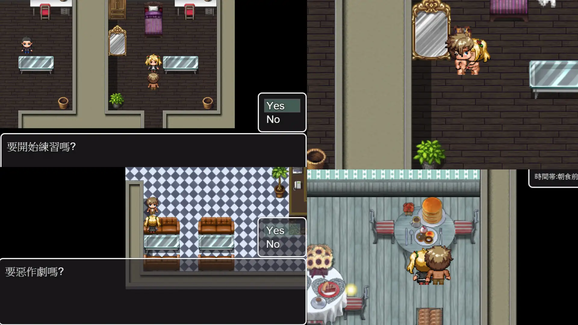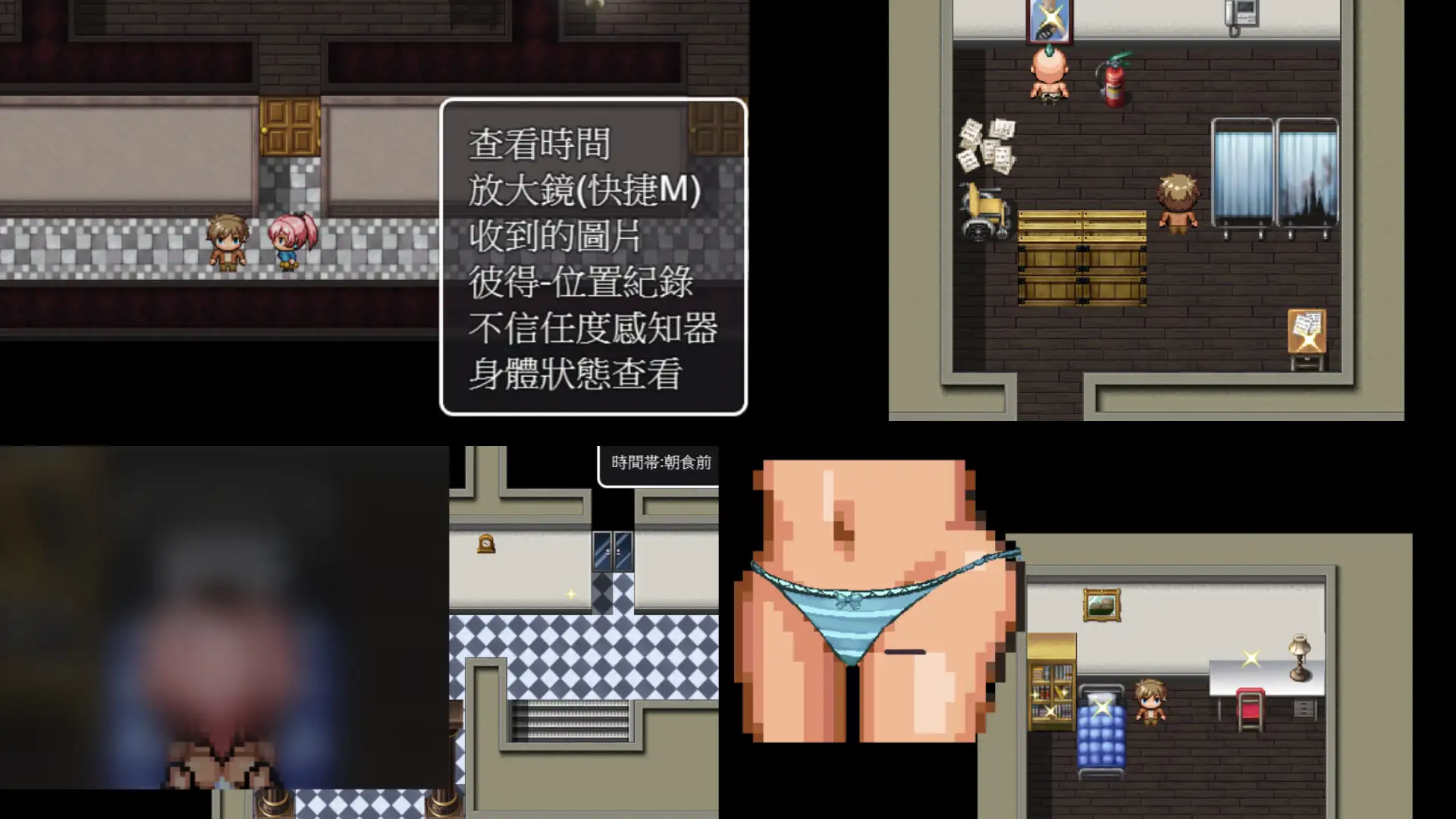1.0.5版本,新增事件解锁房,可得知已解锁哪些事件游戏概要一对情侣参加了某场观察实验,在30天的实验中被NTR的故事,是一款男主角视角的NTRPG探索游戏。※无CG※无战斗※H事件为点阵动图※游戏类型:隐奸、邻邻、寝取※H点阵图210个(rpgmaker模式的像素动画)※超过300个H活动※游戏时程30天,每一天都是不同的剧情※游戏一天充满8个时间段※部分天数有标志机制,同一天会有不同的剧情发生(增加重复配置的可变性)※数值系统和大量选项影响后续剧情和衍生事件※风景系统,可查看女性主要身体上的各种肖像※3条路线,无数的小分支※24种结尾,根据玩家的选择对应数值,会触发长短不一的不同结尾(无周目限制)※初见游戏通关一次结尾的流程时间约8~10小时故事内容诚浩二和女儿莉娜参加了一个实验,在一座巨大的设施中度过了三十天的时间,他们遇到了另一组参与者——洛德与伊芙,虽然只要平静度过应该就可以了,但洛德以练习的名目让诚浩二可以和伊芙锻炼性技巧,而他似乎也对莉娜怀有一些想法……游戏特色这款游戏是男主角视角、纯像素、没有战斗系统的探索类型RPG游戏。游戏中共有8个时间段,早餐前、早餐后、下午、晚餐前、晚餐后、洗澡后、半夜尿前和尿尿后,用于呈现事件时间段的变化。游戏分为前期(1~10天)、中期(11~20天)和后期(21~30天)。前期主要让玩家带入诚浩二的视角开始游戏的主旨NTR,并熟悉游戏机制与流程。当女主角紧随其后时,查看她的状态或许能发现什么东西。中期开始,会参考各式评分系统的出现,会参考玩家的行动并选择衍生剧情事件,不管是尝试阻止NTR还是冷眼旁观都有相应的后续剧情,并且每日都有3套随机套用,每次都玩能够拥有不同的游戏体验,在前期已经定型的流程中产生变化增加新鲜感。后期,追加身体风景顶部系统,可用手机查看女主角的各种正字记号和文字。前面所积累的数值会在这个时期反映出来,不管是玩家的性格倾向、莉娜和伊芙的心理状态,玩家能够选择的行动,都会有相对应的改变,同时因应玩家前面的选择,有3条主要路线可以进入,并且拥有丰富的结束数量,要以怎样的过程达到什么样的结束,都看玩家自己的选择。