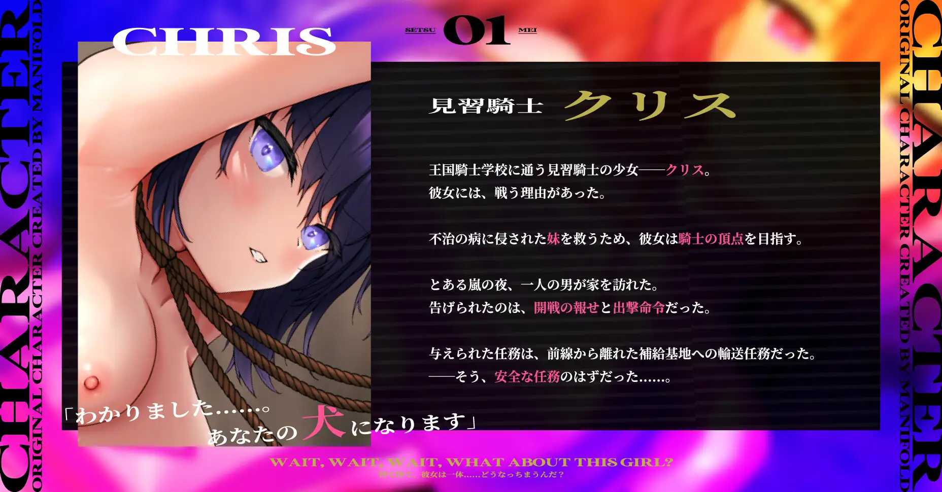 剧情介绍:克里斯心中有一个愿望,她有一条命想要守护。她唯一的家人,妹妹莉莉,正被一种病魔侵袭。这是一种被认为治疗困难的绝症。剩下唯一的希望,就是传说中的魔法药水——艾利克萨。然而,对于平民来说,获取艾利克萨几乎是不可能的。更何况是那些少女们……克里斯思考着,如何获得这个奇迹。她思考着,如何拯救自己的妹妹。于是,她敲响了王国骑士学校的大门。在她立志出人头地的道路上,面前矗立着一道又一道的壁垒。在狂气弥漫的战场上,她的内心又在想些什么呢——