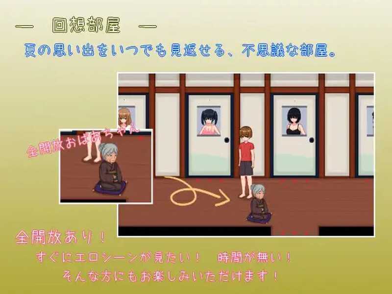 游戏概述:这是【ピクトルサーカス】社2022年5月11日发布的一款热门像素SLG游戏。游戏在DL上发售已经卖出了22000+的超高销量,属于爆款热门佳作游戏~&主题是喜闻乐见的男主回到乡下,和大姐姐们度过一个月的奇妙暑假生活。游戏完全动态进行,自由度极高,可以在屋内和户外自由活动自由探索事件。最新Ver2.0追加海滩,澡堂和多个新女角色。游戏有CV语音,回想屋跟老奶奶对话开启全回想。 游戏内容:男主小弘暑假独自来到了乡下的远房亲戚家。接待他的是和他小时候一起玩耍的儿时玩伴,然而她们都长大了~3面对四位身材和性格都各异的漂亮大姐姐们,男主将如何度过暑假?可以买东西,自己做食物,到海边和河里钓鱼,还可以建立秘密基地…探索和完成各种事件,提升和姐姐们的好感度,触发各种奇妙的事情~不仅在房间,还可以在浴室、厕所、神社、秘密基地、巴士站发生… 游戏特点:-全像素动态进行游戏,自由探索屋内和户外各种地方,触发和完成事件任务。-能做的事情非常多,可以买东西,做食物,海边和河里钓鱼,建立秘密基地…-完成各种事情提升和女主们的好感度,每个女主有6种不同的奇妙事件,有像素动态场景和大动画场景。-可以和大姐姐们在各种场所做奇妙的事情,不仅在房间,还可以在浴室、厕所、神社、秘密基地、巴士站发生…4-回想屋可以直接开启全事件CG回想,方便没时间玩的人直接社保。Ver.2.0.0 内容增加更新内容如下:·在神社前增加了“蓝色巴士站”。·现在可以从蓝色巴士站前往“温泉”。·新增地图“渔人屋前”、“海滩”和“岩石区”。·追加角色“海咲”、“爱波”、“七波”。·现在可以在海边玩“海水浴”了。