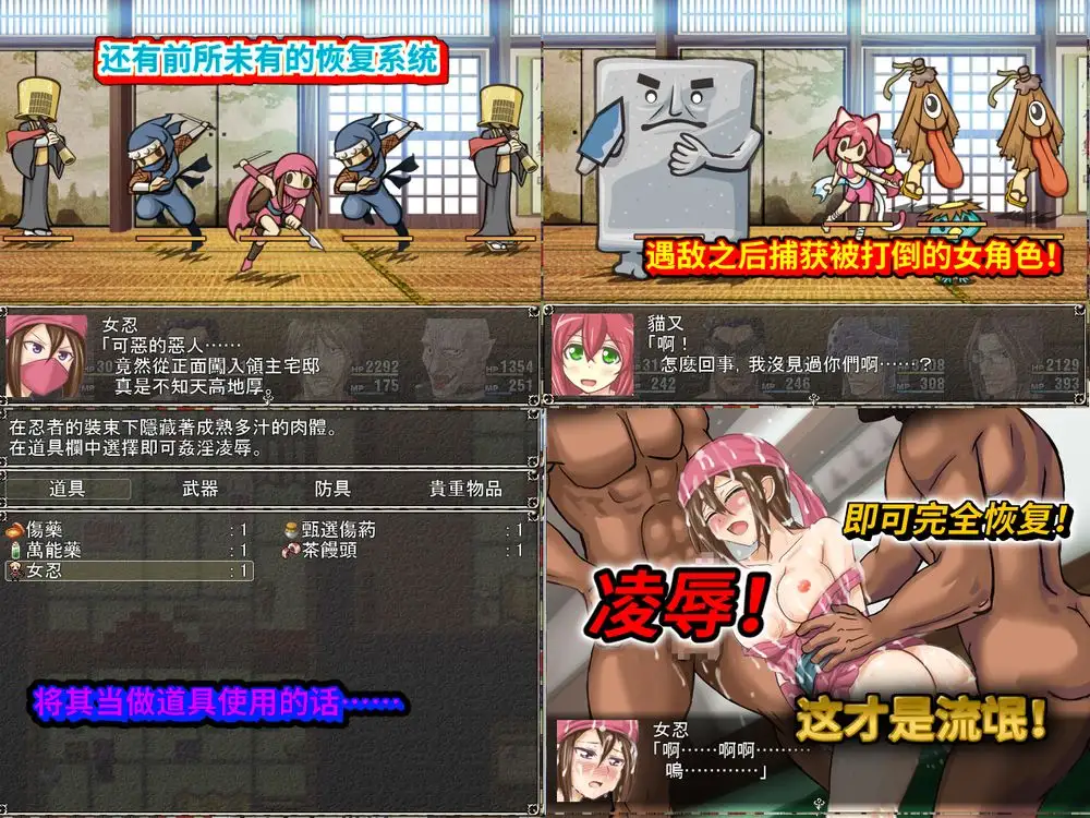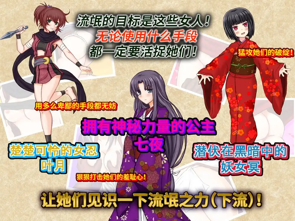这部游戏没得升级,没得任务甚至连什么剧情设定也没有总的来说就是干!这次的主人公是六个没事做的老流氓听说了东方一个叫“霓虹”国家的公主将要途经此地不仅公主娇艳美丽。随行的各种女侍从,女忍者也都是公主的陪嫁自然美的不可玩物在这个信息闭塞的时代,这群欧洲土鳖一下子被和风美女全都勾走了魂~于是,他们决定:干它喵的!!
