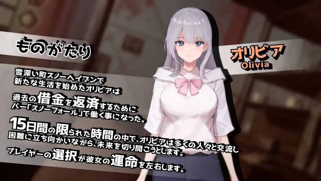 冬季雪深的城镇“雪之天堂”中,有一家热闹的酒吧“雪之瀑布”。在这灯火通明的背后,秘密进行的交涉和交易。在华丽店内工作的女主角“奥莉维亚”,为了偿还债务,寻找新的生活而来到这个镇上。您作为玩家,将成为这家酒吧的老板兼经理,帮助奥莉维亚偿还债务。然而,她的命运掌握在您的选择之中……。她将迎来怎样的未来,全凭您决定。