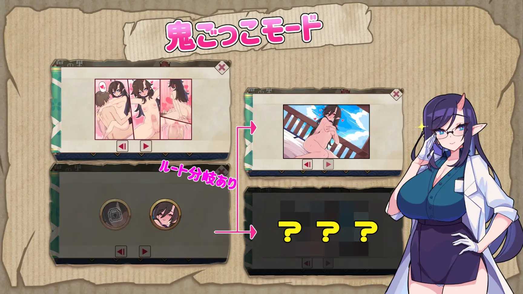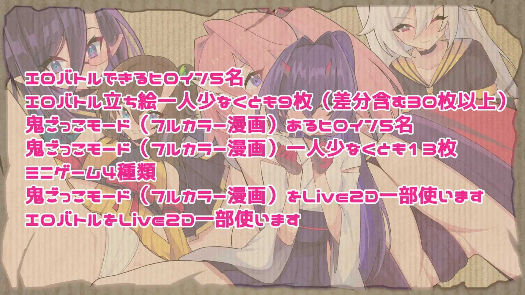 很久很久以前,鬼族和人类和平共处。然而,随着共同度过的时间变长,两个族群之间产生了分歧……最终,战斗在两个族群之间爆发……战斗以鬼族的失败而告终………………………………某一天,鬼族开始传播原因不明的奇怪疾病患上这种疾病的鬼族无法生育男性鬼的后代成年后的男孩们在鬼族村庄生活并与鬼族女性生下了孩子鬼族中有些人认为这是与人类再次共存的机会,为成年男孩们开始了「祭典」……………………可以进行色情战斗的5个女主角至少9张色情战斗立绘(包括差分,总共30张以上)鬼捉迷藏模式(全彩漫画)的5个女主角至少13张鬼捉迷藏模式(全彩漫画)4种小游戏部分使用Live2D技术的鬼捉迷藏模式(全彩漫画)部分使用Live2D技术的色情战斗