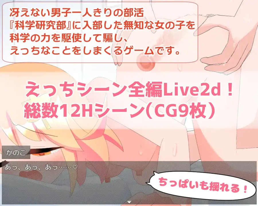 ◆剧情简介因偶然契机加入了仅有一名部员的社团”科学研究部”的女孩。被其貌不扬的部长用透视身体、操控视觉等方式,被迫握住奇怪的东西、含住异物,被操控了触觉,以至于没有察觉到身体正在被触摸。而最后则是……。◆情色场景概要・透过透明眼镜透视内衣、全裸、张开双腿・通过操控五感进行手交、kou交、插入内she・三名女学生在“猜猜盒中物”游戏中遭遇不幸◆情色场景总数・立绘透视场景×3・静态 CG×9总计 12 种色情场景。所有色情场景均采用 Live2D 动态呈现!◆特别推荐给觉得游戏麻烦或忙碌的人!没有任何繁琐的游戏元素!只需点击即可,线性剧情,即刻进入色情场景!想冲就冲,即刻直达心动场景的现代游戏!※因技术原因,仅有一个 H 场景采用视频文件形式呈现,敬请知悉。