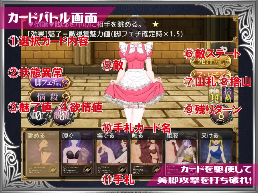 游戏概述:勇者在南部海岸休养着冒险的疲惫。(虽然也有尖酸刻薄的传言说“…不过是借机欣赏女性泳装姿态”……但终究只是谣传)然而就在这天,假期被突然打断,紧急重大的任务降临。目标是那座被称为「勇者杀手」的石塔——别名「美腿塔」的探索任务。在这座充满谜团的卡牌之塔中,剑与魔法皆被封印,唯一依靠的是具有特殊效果的纸符!所需乃是智谋与运气,不可或缺的是纯洁灵魂与健康的性癖。(据说若容易被诱惑或持有特殊癖好,将会陷入困境)勇者此刻,正踏入这座考验来访者本性的「美腿塔」!