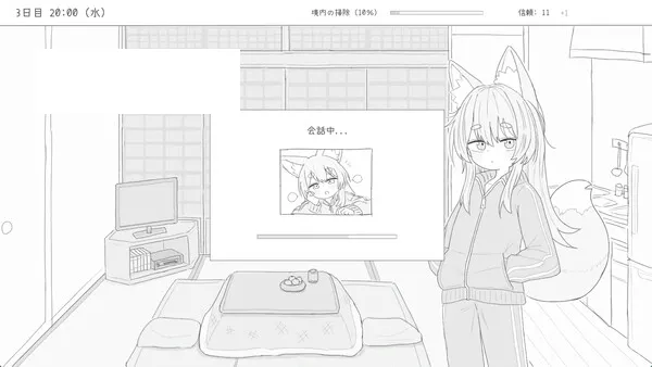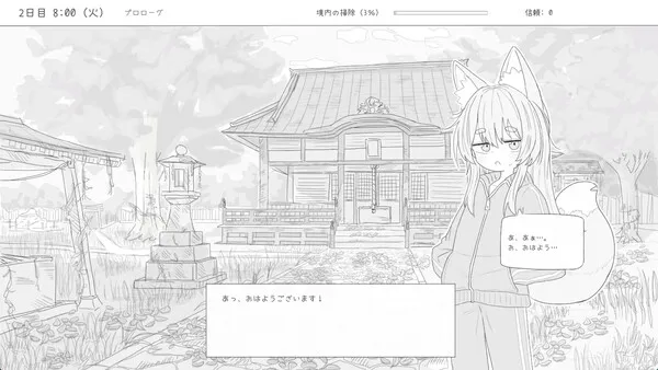游戏介绍照看本地神社,与住在那里的狐娘万尾共度30天。在这款轻松的模拟游戏中,你需要在打理事务与增进感情之间取得平衡。好好把握时间,也许她会舍不得你离开。由于前任管理者去世,你被指派负责打扫家乡的神社。起初这只是个麻烦的差事,直到你遇见了神社的住客,狐娘万尾。她已经多年未与人类接触,对你十分警惕,但似乎也在默默认可你对神社的用心。你逐渐被这个神秘又孤独的存在吸引,渴望更深入地了解她。三十天的打扫工作,似乎也不再枯燥。到最后,你是否能打动这位狐娘的心呢?每天你都需要打扫神社,而在这个过程中,万尾会逐渐对你敞开心扉。提升她的信任度可以解锁更多互动内容,包括与她的交流以及周围环境的变化。你只有30天时间,如何在责任与陪伴之间分配,将决定最终的结果。若能在期限内将信任值提升到100,就能达成与可爱狐娘的完美结局。时间管理每天可执行的行动有限,不同的选择会影响不同数值的变化。每一步都要深思熟虑,把握好节奏。培养关系每天的行为选择会影响你与万尾之间的信任度。当神社打扫任务结束,你们的关系将走向何方?你会选择留下,还是继续前行?存档功能游戏可随时保存进度,方便你回溯某些关键选择。也许有一天你会后悔,没去摸摸她的尾巴而是去打了个盹。