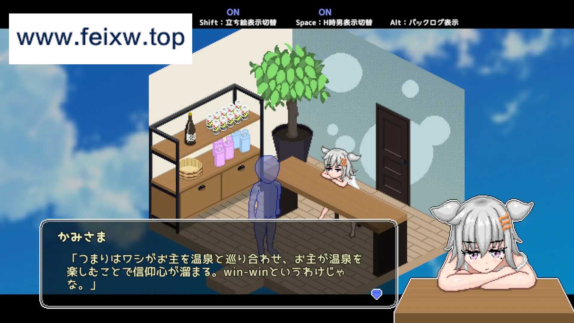 游戏简介:度过了漫长而疲惫的一周,是时候放松身心了!一位勤劳的男子发现了超越单纯是放松运动的事:一个由温泉之神经营的秘密商店!温泉之神愿意用她的祝福换取她的信仰,玩家的任务便是享受尽可能多的温泉。温泉之神的第一个祝福揭示了一个隐藏在深山中的幽静之地,在那里他注定会遇见纱耶香——一个同样热爱温泉的美丽女孩以及……她那想在布满蒸汽的浴室里做顽皮事情的欲望。这是一个关于爱、休闲和性爱,以及为了温泉之神聚集信仰的故事!
