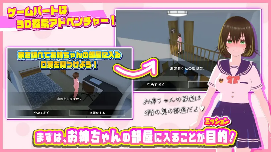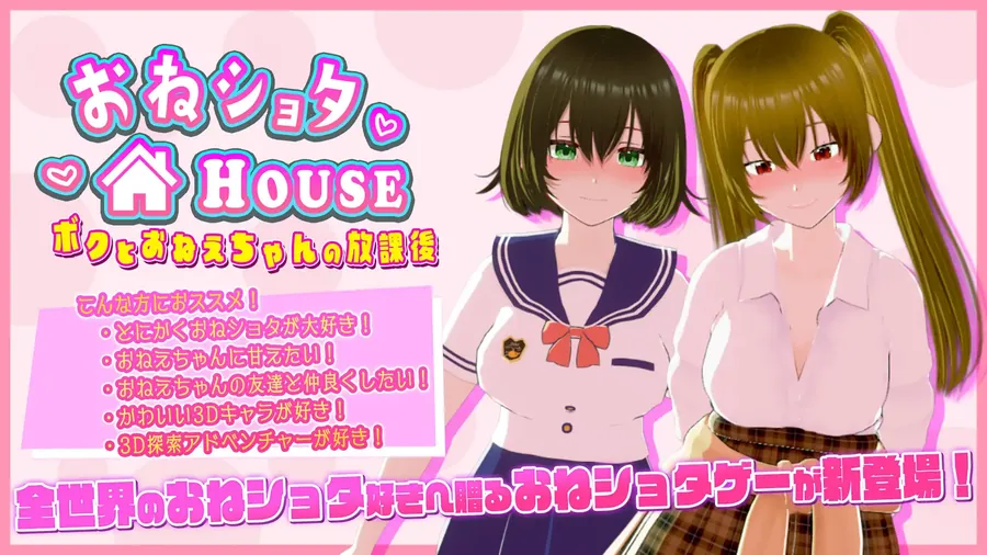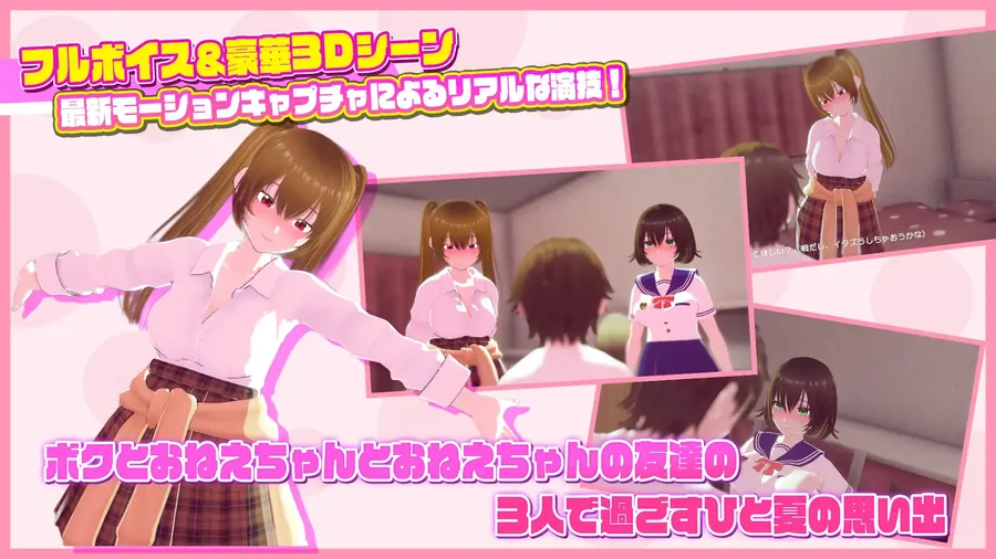 游戏概述:▼ 怀旧风×御姐正太体验 3D 冒险游戏▼专为御姐正太控打造的御姐正太游戏全新登场!与姐姐和姐姐的朋友共度三人的夏日课后时光。全程语音×全3D亲密场景,尽情享受甜蜜又火热的夏日回忆!▼推荐给这样的你▼・单纯超爱御姐正太组合!・想向姐姐撒娇・想被姐姐的朋友捉弄・想要尽情发she・比起正戏更喜欢挑逗前戏!・想体验游戏引擎「Unity」打造的高品质3D・喜欢3D探索冒险游戏的人▼游戏概要・探索环节▼在放学后的家中展开探索,找出进入姐姐房间的借口(理由)吧。可以是请她辅导功课,有时还会遇到正式的解谜环节…?只要能成功进入姐姐的房间,亲密互动就会开始。-夏日的放学后–回荡着暮蝉鸣声的黄昏家中—-略带一丝怀念感的怀旧风御姐正太体验