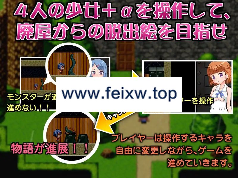 ■发售日期:2023年09月29日分类:萝 外she 捆绑/紧缚 放尿/小便 触手 口内she精/口爆 平胸/飞机场 白虎/无阴毛2023年10月03日 修复BUG修正了无法进入第二周结局等错误。■故事被困在森林中的废弃小屋里的4名少女。一旦被敌人抓到就会发生色情的逃脱RPG。■规格●操作多名少女,从建筑物中逃脱。没有升级等机制,四名迷失的少女们通过切换每个人的视角,试图让所有少女成功逃脱为目标。●动画插入和被敌人捕获后即时事件场景。受到敌人攻击时,会随机显示动画插入。当然,战败给敌人时将有全程配音的失败场景。此外还有各角色的小便场景等丰富的事件。●基本CG17张(不包括立绘),含差分共76张。●回忆和CG浏览模式。在游戏内,可以反复观看已经观赏过的事件场景。声优:天川みるく、かの仔、霜月優、森野めぐむCG:熊猫ろここ剧本:文音影丸注意事项:1.压缩包一共两层,第一层为rar,第二层为自解压exe.2.第二层自解压exe解压密码是一样的.3.如第二层自解压exe提示无法运行.请把exe后缀改为解压后缀正常解压(如7z.rar.zip之类)