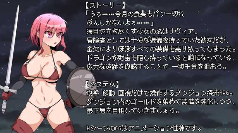 『游戏概述』「唉……这个月的食费只够一片面包呢……」泪眼朦胧地站在原地的少女名叫娜维亚。作为一名冒险者,她拥有足够的装备,但因为财政紧张,几乎把所有装备都卖了,现在只剩下几件勉强能遮体的衣服。她面前是一座传言中有龙藏有宝藏的广大遗迹。她正计划攻略这座遗迹,以图翻身一夜致富。「冒险结束后,我要重新买回卖掉的铠甲,还要吃个肚子饱的牛排!」[游戏性]这是一款探索型RPG游戏,玩家可以探索地牢,用获得的金钱加强自己的能力,并朝着最底层目标前进。尝试不同的路线,找到效率高的赚钱方法,发现击败强大敌人的方法。如果被boss打败,游戏将切换到H场景。H场景均以动画形式呈现,玩家可以欣赏娜维亚丰满身体的摇摆。具有回想全开放功能。(场景中对话较短)