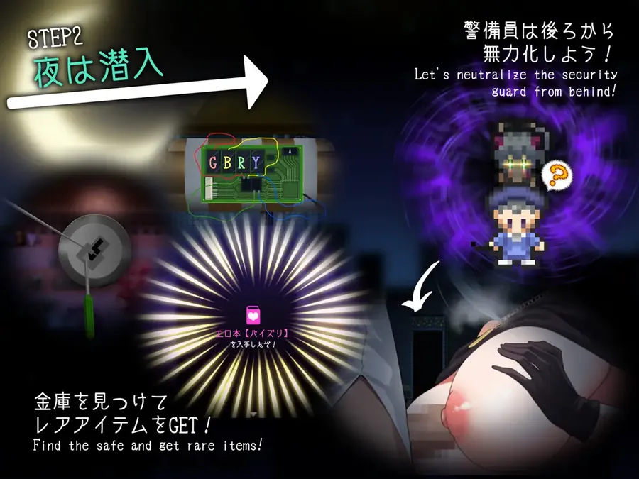 剧情梗概在某个地区的小镇——泥露街(Doro街)——这里活跃着一个极具魅力的盗贼组织“多龙邦”(Doronbone),而组织中的新星“琪蒂”(Kitty)凭借其诱人的身材和磨炼到极致的性技,专门从恶人手中榨取钱财。然而,在她潜入某座宅邸并盗走一张神秘的“软盘”的那一夜起,她们的命运开始走向疯狂……详细解析◆ 潜入设施任务 ◆潜入作为地下城的设施,夺取稀有宝物吧!目标是避开巡逻的警卫和各种陷阱,成功盗取宝物并安全返回。◆ 尽情榨干!【狩猎性技】 ◆在迷宫最深处,有着毫无防备的Boss。运用你掌握的性技,自由地、尽情地与其交合。根据榨取的jingye量,还可获得额外奖励!◆ 现代都市冒险RPG! ◆夜晚工作的琪蒂白天可是闲得很。自由探索城市,教训混混提升等级,在餐厅享受美食,或是帮助有困难的居民解锁新功能吧!◆ 与同伴的互动与协作 ◆潜入任务中获得的宝物除了可以换钱,还能作为礼物赠送给同伴。提升好感度后,便可组队同行。一起在街头教训混混,帮助有困难的居民吧!◆ 与同伴的激情合作 ◆随着与同伴的好感度提升,她们会参与短篇H场景或狩猎性技等激情玩法。与个性鲜明的伙伴们协力,用各种性技将男人的jingye榨干吧!