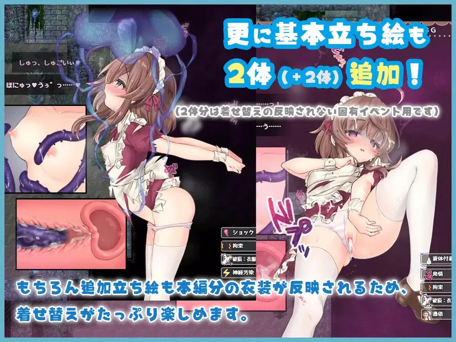 游戏流程操作简单、以立绘色图为主的RPG!「赛缇和活祭的森林」中登场的女仆莉可、将是本作的主人公。※非原作的续作、和原作的故事没有关联、所以本作无需补充前作的知识。===================休假获准的莉可,与朋友们一同前往「大海与白壁房屋交相辉映的街道」因努力收集宝藏而获得主人奖励休假的莉可。她邀请朋友们共赴以美丽海景闻名的港口小镇「伊尔玛雷」度假!然而伊尔玛雷存在着各种问题,祭典的举办似乎岌岌可危……为了解决问题,莉可开始四处奔走!游戏内容介绍为帮助在伊尔玛雷结识的某位人物,莉可女扮男装潜入禁止女性进入的「帮派据点」!若是女性身份暴露,可能会引发无法挽回的后果……通过调配可水下活动的魔法药,前往深海中的「海底遗迹」!全新的色情陷阱与魔物立绘色情场景正等待着莉可。受委托寻找失物,莉可潜入充满诡异气氛的「废弃研究所」。她能否突破重重色情机关与魔物的色情攻击,成功找到目标物品!?通过新换装道具打扮自己、偷窥朋友们遭遇的色情事件、体验钓鱼/酒馆经营/卡牌对战等小游戏,尽情享受假期吧!新配角女主角介绍奈莉奈(CV:高梨はなみ 饰)诺亚泽特的妹妹。在DLC「假期!」中从昏迷状态康复!性格充满求知欲。爱好机械改造,常制造创意奇特且用途不明的机器人让周围人(尤其是姐姐)惊讶。虽然非常喜爱优秀的姐姐,但内心怀有自卑情结。对魔物的心理创伤似乎尚未痊愈……大幅强化的系统全面升级场景回忆界面,采用缩略图列表显示,新增收藏夹与预设功能,操作更便捷!支持日志窗口移动与尺寸调整!服装破损系统细化至装备四个部位可分别破损!事件对话场景也会反映换装效果!试穿功能扩展至头部/内衣/袜子装备!新增独特色情状态与色情体质图标!此外,通过重构底层处理实现多项优化,大幅提升运行稳定性与流畅度!